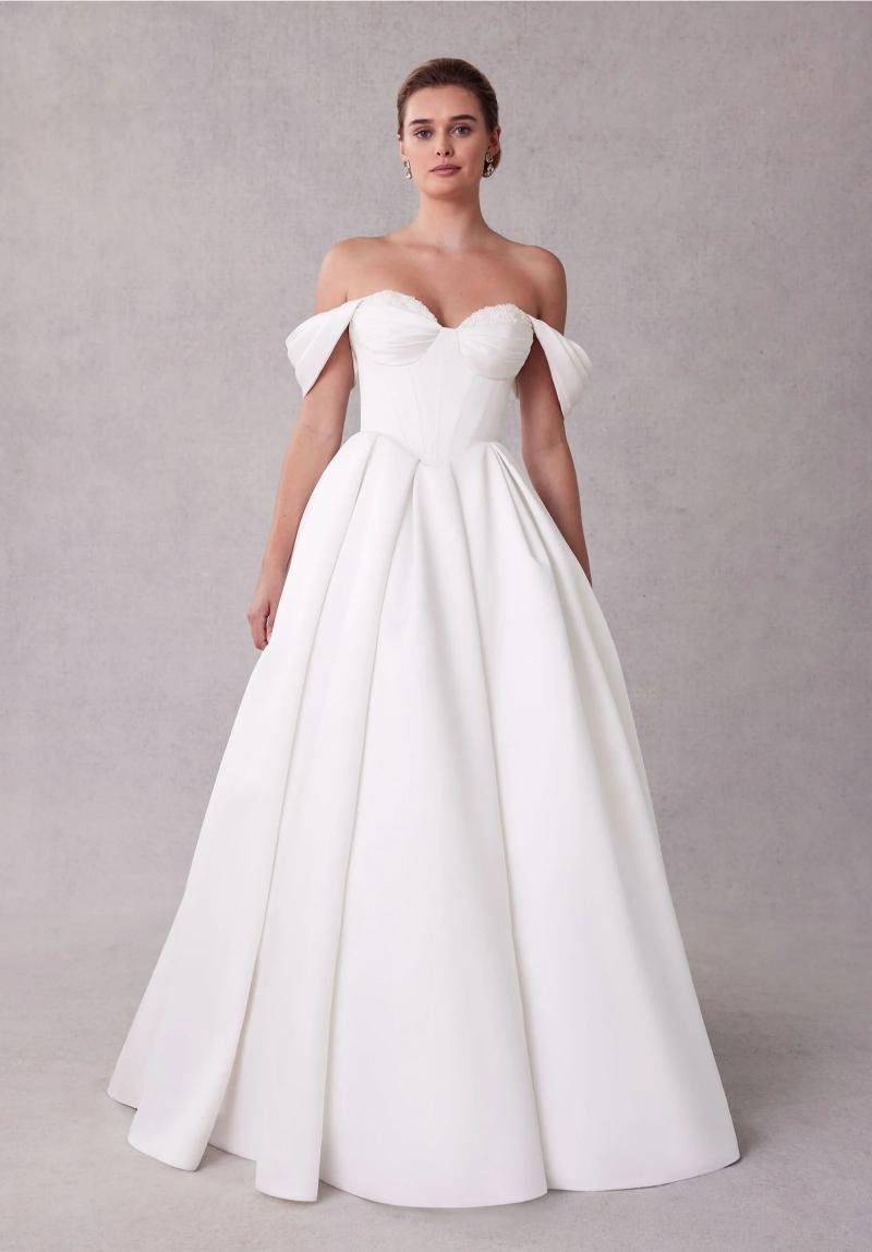 This elegant off-the-shoulder ball gown features a structured corset bodice with delicate draping and a sweetheart neckline. The voluminous pleated skirt adds a regal touch, creating a timeless and sophisticated bridal look.