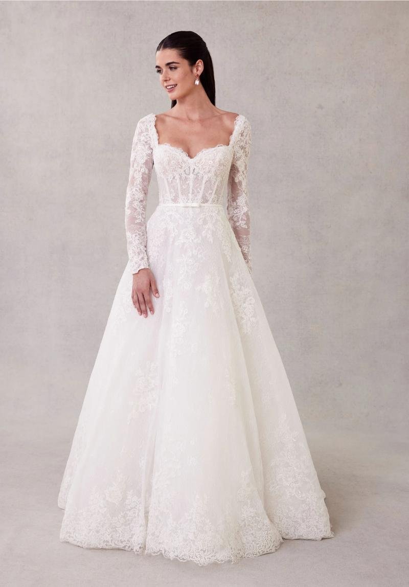 Timeless elegance meets modern romance in this stunning long-sleeve lace gown. Featuring a flattering sweetheart neckline, sheer bodice with delicate boning, and a soft A-line silhouette.