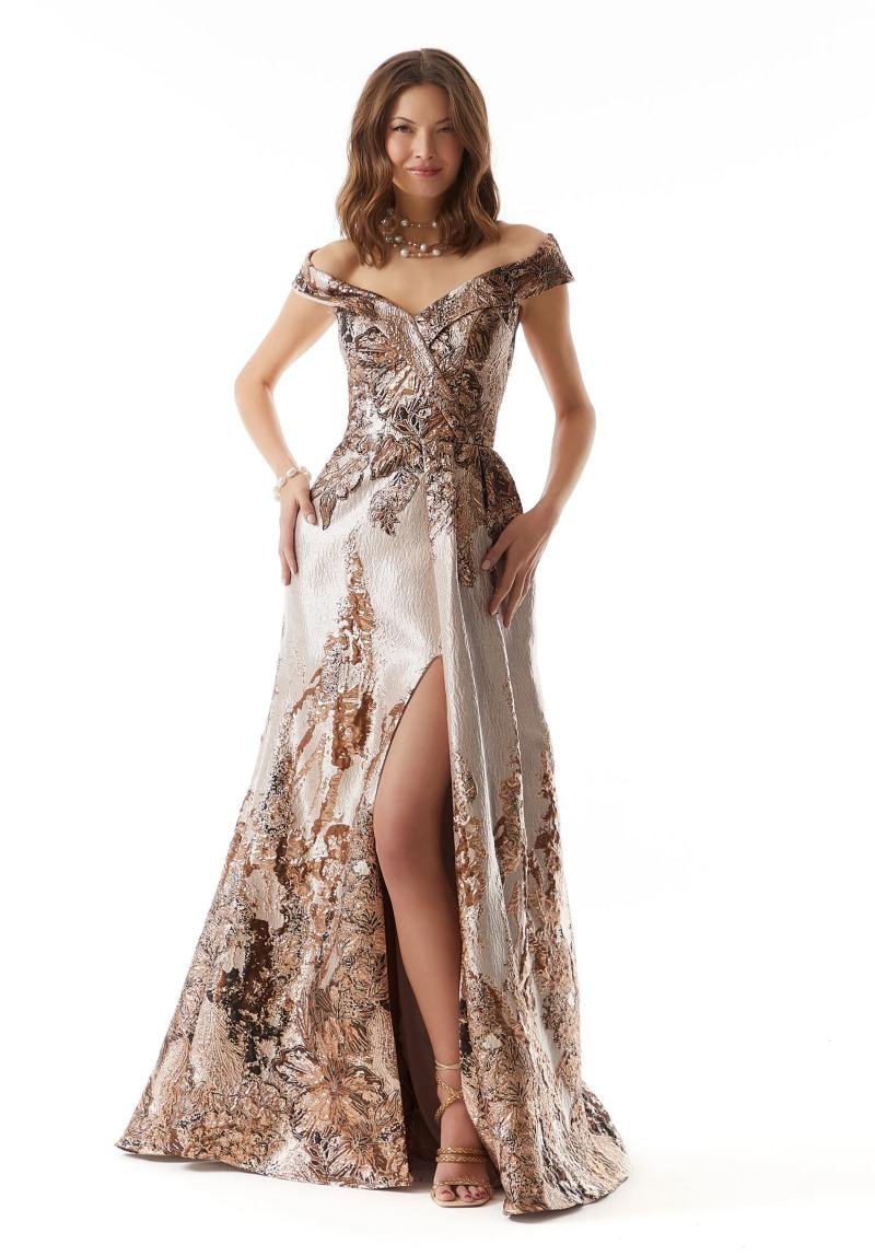Elegant evening gown has a surplice bodice with delicate cuffed detail and full skirt with a front drape in metallic jacquard fabric.