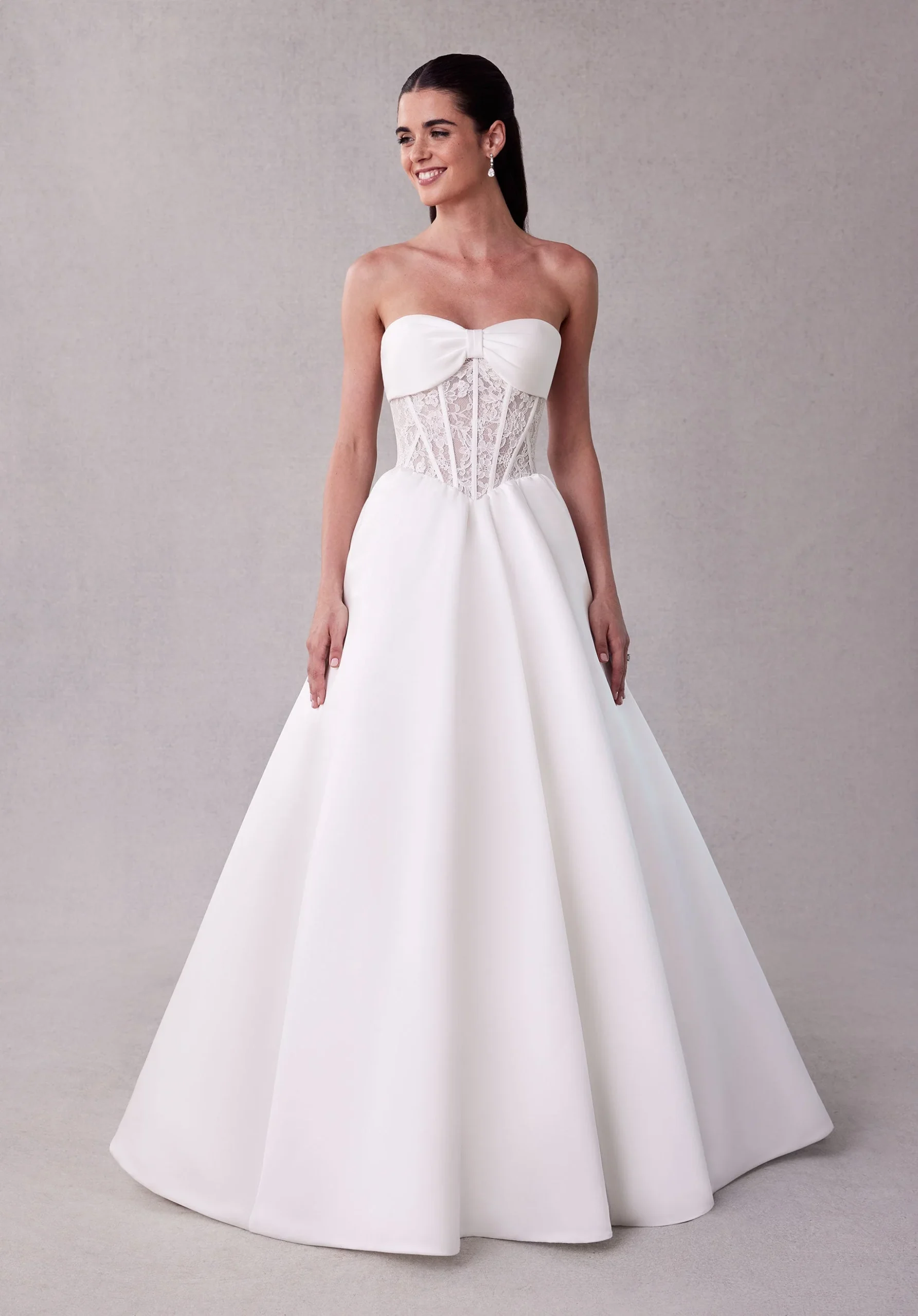 Chic wedding dress has a strapless, satin bow neckline with an Alençon lace corset bodice on a satin ball gown skirt.